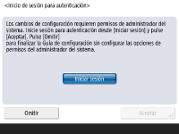 Inicie la sesión con autenticación para configurar las opciones que requieren privilegios de Administrador. ![]() ![]() Pulse <Iniciar sesión> y vuelva a introducir el nombre de usuario y la contraseña de un usuario con privilegios de administrador. El nombre de usuario predeterminado del administrador es "Administrador", y la contraseña predeterminada es "7654321". Vuelva a pulsar <Iniciar sesión> y luego pulse <Aceptar>. Si introduce la contraseña predeterminada de fábrica, aparecerá la pantalla pidiéndole que cambie la contraseña. También puede cambiarla más tarde. Inicio de sesión como Administrador Puede omitir las opciones que requieren privilegios de Administrador y proceder al paso siguiente pulsando <Omitir>. En este caso, proceda al Paso 10. | |