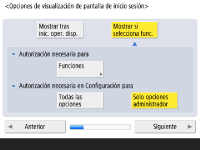 Para aumentar la seguridad del equipo, utilícelo en un sistema que emplee autenticación de usuario. ![]() Este equipo está configurado para emplear la autenticación de usuario como servicio de inicio de sesión. Para obtener más información, consulte Configuración de las opciones de administración de autenticación personal. ![]() Pulse <Sí> para <Usar autenticación de usuario>, pulse <Sí> para el método de inicio de sesión que se va a utilizar y pulse <Siguiente>. Si no emplea la autenticación de usuario, pulse <No> para <Usar autenticación de usuario>, pulse <Aceptar> y continúe al Paso 5. ![]() Indique las opciones siguientes si no hay administradores aparte del usuario "Administrador" registrado en el equipo. ![]() Si desea mejorar la seguridad del equipo deshabilitando el usuario "Administrador" y registrando un nuevo administrador, pulse <Sí>. En Registrar Administrator, introduzca <Nombre de usuario> y <Contraseña>, y pulse <Aceptar>. Especifique <Dirección de e-mail>, <ID dpto.> y <Mostrar nombre> según sea necesario. Para obtener más información, consulte Registro de la información de usuario en el dispositivo local. El usuario "Administrador" estará desactivado la próxima vez que inicie sesión. Para actuar como "Administrador", pulse <No>. ![]() ![]() Seleccione el momento en que desea mostrar la pantalla de inicio de sesión. Si selecciona <Mostrar si selecciona func.>, pulse <Funciones>, seleccione la función de la que desea mostrar la pantalla de inicio de sesión y pulse <Bien>. Seleccione también los elementos de configuración de la pantalla <Configuración> de los que desea que se muestre la pantalla de inicio de sesión. Si selecciona <No> para <Autenticación mediante teclado>, pulse <Aceptar>. Diríjase al paso 5. Si selecciona <Sí> para <Autenticación mediante teclado>, pulse <Siguiente>. ![]() ![]() Para utilizar la autenticación a través de la entrada mediante solo teclas numéricas, pulse <Sí> y <Aceptar>. | |