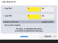 Especifique las opciones de la conexión de red. ![]() ![]() Pulse <Sí> para <Usar IPv4> o <Usar IPv6>, y pulse <Siguiente>. También puede utilizar IPv4 e IPv6. Si pulsa <No> para <Usar IPv4> y <Usar IPv6>, y pulsa <Aceptar>, omita las opciones de red y continúe al Paso 9. ![]() Si pulsa <Sí> para <Usar IPv4>, especifique las opciones siguientes. ![]() Para obtener la dirección IP automáticamente, pulse <DHCP> o <IP autom.>, y pulse <Siguiente> o <Aceptar>. Para configurar la dirección IP manualmente, quite la selección de <DHCP> o de <IP autom.>, pulse <Dirección IP>, <Máscara de subred> y <Dirección de puerta enlace> para introducir cada valor, y pulse <Siguiente> o <Aceptar>. Para obtener información sobre las opciones de la dirección IPV4, consulte Configuración de una dirección IPv4. ![]() Si pulsa <Sí> para <Usar IPv6>, especifique las opciones siguientes. ![]() Pulse <Sí> para utilizar la dirección sin estado, o <No> para no utilizarla, y pulse <Siguiente>. Para obtener información sobre la dirección IPV6, consulte Configuración de una dirección IPv6. ![]() Tras especificar la dirección sin estado, indique las opciones siguientes. ![]() Pulse <Sí> para utilizar la dirección manual, o <No> para no utilizarla, y pulse <Siguiente>. Para utilizar la dirección manual, pulse <Dirección manual>, <Longitud de prefijo>, y <Direc. enrutador prefij.> para introducir cada valor. ![]() Tras especificar la dirección manual, indique las opciones siguientes. ![]() Pulse <Sí> para utilizar DHCPv6 o <No> para no utilizar DHCPv6, y pulse <Aceptar>. | |