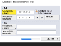 Especifique la dirección del servidor DNS, el nombre del host DNS y el nombre del dominio DNS. ![]() ![]() Pulse <Servidor DNS primario> y <Servidor DNS secundario>, introduzca la dirección IPV4/IPv6 para el servidor DNS y pulse <Siguiente>. Para obtener información sobre las opciones de la dirección del servidor DNS, consulte Configuración de las opciones de DNS. ![]() ![]() Pulse <Nombre de host> para introducir el nombre del equipo (nombre de host). Pulse <Nombre de dominio> para introducir el nombre de dominio al que pertenece el equipo, y pulse <Siguiente>. Si las opciones de IPv4 y IPv6 son iguales, pulse <Sí> para <Mismo nombre host/dominio que para IPv4>. ![]() ![]() Para actualizar automáticamente mediante las Opciones de actualización dinámica de DNS, pulse <Sí> para <Actualización dinámica de DNS>, y pulse <Aceptar>. Si configura <Actualización dinámica de DNS> para <IPv6> como <Sí>, seleccione <Sí> para registrar los elementos automáticamente. | |