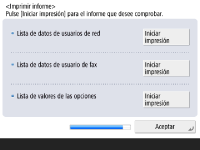 Puede imprimir la lista de usuarios de la red, la lista de datos de usuarios de fax y la lista de valores ajustados. ![]() ![]() Pulse <Iniciar impresión> para el informe que desee imprimir. Una vez finalizada la impresión, o si no desea imprimir una lista, pulse <Aceptar>. | |