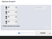 Compruebe que el papel cargado en los casetes está bien especificado. ![]() ![]() Si los tamaños del papel son correctos, pulse <Aceptar>. Para obtener información en pantalla e instrucciones sobre cómo cambiar las opciones, consulte Especificación del tamaño y el tipo del papel en el casete. Si no ha iniciado sesión como administrador, continúe con el paso 10. | |
