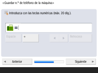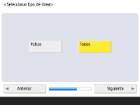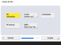 Especifique las opciones necesarias para utilizar la función de fax. ![]() Si su equipo no dispone de función de fax, continúe con el paso 10. Seleccione el país/región si aparece la pantalla de selección, y pulse <Siguiente>. ![]() ![]() Introduzca el número de fax y pulse <Siguiente>. Para obtener información sobre las opciones del fax, consulte Opciones de línea de fax. ![]() ![]() Pulse <Establecer>, introduzca el nombre de usuario y pulse <Siguiente>. ![]() ![]() Seleccione el tipo de línea y pulse <Siguiente>. ![]() ![]() Pulse <RX automática> cuando utilice únicamente la función de fax o <Fax/tel (cambio aut.)> cuando haya conectado un teléfono o un auricular al equipo, a continuación, pulse <Aceptar>. | |