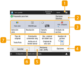 Al pulsar <Leer y guardar> en la pantalla de <Inicio> y, a continuación, pulsar <Red> o <Dispositivo de memoria> para leer los originales, aparece la pantalla de configuración siguiente.
