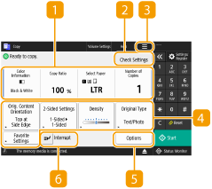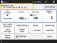 Exibe o status de configuração como a taxa de cópias, o tamanho do papel e o número de cópias. Certifique-se de confirmar as configurações para copiar corretamente. Quando você desejar mudar uma configuração, selecione a configuração desejada em