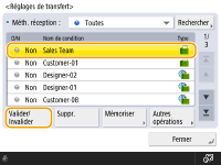 Vous pouvez aussi afficher l'écran <Réglages de transfert> en appuyant sur <Réglages dest./transf.>(Ecran <Accueil> Screen) <Réglages de transfert>. |