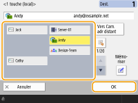 Liste déroulante des listes d'adressesVous permet d'afficher un groupe spécifique de destinataires. Quand vous êtes connecté à l'appareil avec la gestion de l'authentification personnelle, vous pouvez sélectionner <Liste d'adr. perso.> pour afficher votre carnet d'adresses personnel.