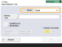 Si vous voulez définir la machine pour que vous puissiez vérifier le résultat d'envoi d'un document sur l'écran <Suivi statut> sélectionnez <Plein>. Sinon, sélectionnez <Simple>. Notez que le destinataire doit aussi accepter le mode de transmission afin de vérifier le résultat de l'envoi. Selon l'appareil utilisé par le tiers, l'envoi d'un I-fax n'est pas possible sauf si vous sélectionnez <Simple>.