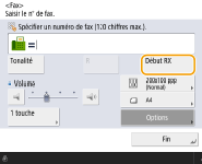 <RX manuelle> ![]() | Lorsqu’il s’agit d’un appel de fax La sonnerie d’un appel entrant retentit. Décrochez le combiné. Si vous entendez un bip, sélectionnez (Accueil) <Fax> <Prise de ligne> <Début RX> pour recevoir des fax.![]() Lorsqu’il s’agit d’un appel téléphonique La sonnerie d’un appel entrant retentit. Décrochez le combiné. Si vous n’entendez pas de bip, commencez votre conversation. ![]() Il est nécessaire de raccorder au préalable votre téléphone à l'appareil. Vous pouvez configurer la machine pour recevoir des fax automatiquement lorsque la sonnerie d’un appel entrant survient dans un délai spécifié. <Activer RX auto> |