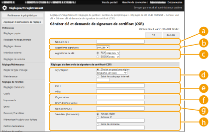 Vous pouvez générer une clé et CSR sur l'appareil. Vous pouvez aussi afficher les données CSR à l'écran et les exporter en tant que fichier.