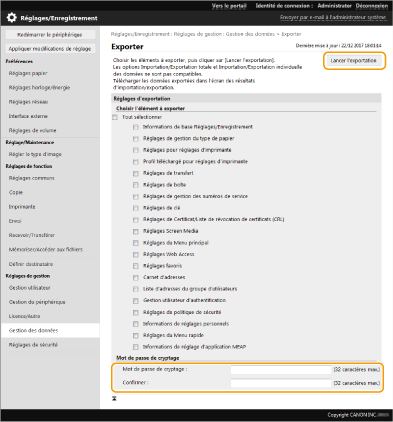 Le mot de passe dans [Mot de passe de cryptage] sera demandé lors de l'importation des données de réglage exportées. Utilisez des caractères alphanumériques.