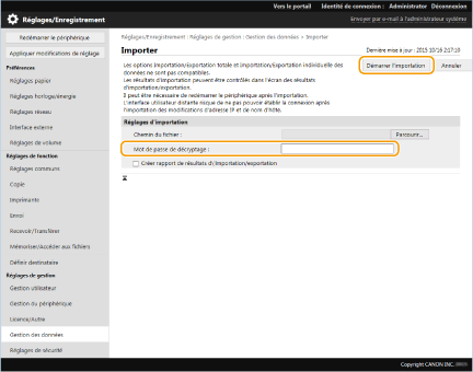 Dans [Mot de passe de décryptage], saisissez le même mot de passe que celui qui a été saisi quand les données de réglage ont été exportées.