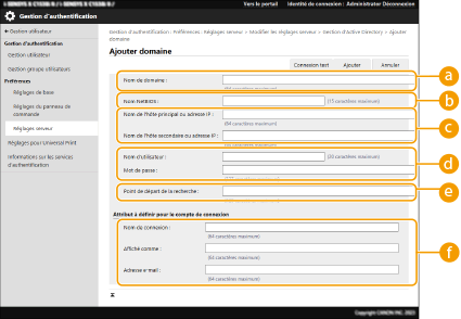 Pour spécifier un serveur Active Directory, Microsoft Entra ID ou LDAP comme dispositif d'authentification supplémentaire, vous devez enregistrer les informations du serveur utilisé pour l'authentification. Effectuez un test de connexion si nécessaire.