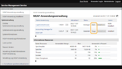 2 | Klicken Sie auf [Start] / [Stopp] für die zu verwendende MEAP-Anwendung. ![]() ![]() Sie müssen das Gerät je nach MEAP-Anwendung neu starten. Befolgen Sie die Bildschirmanweisungen, und starten Sie das Gerät neu. Wenn die für Speicher, Threads, Sockets oder Dateideskriptoren benötigten Ressourcen erschöpft sind, wird die Anwendung nicht mehr gestartet, selbst wenn Sie auf [Start] klicken. |