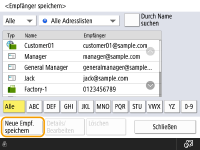 ![]() | Sie können die Faxnummer oder die E-Mail-Adresse eines Empfängers im Adressbuch registrieren und diese dann beim Senden von gescannten Dokumenten verwenden. Außerdem können Sie ein I-Faxziel, ein Dateiserver-Speicherziel (IP-Adresse und Pfad) und den Speicherplatz (Erweiterter Platz) eines Canon-Multifunktionsdruckers als Ziel im Adressbuch registrieren. |