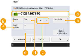 1 | Geben Sie eine Faxnummer ein. ![]() FaxnummernfeldGeben Sie mit den Zahlentasten eine Faxnummer ein. Geben Sie bis nach Bedarf ein. <Löschtaste> Löschen Sie Zahlen links neben dem Cursor im Faxnummernfeld ( ) nacheinander.![]() /![]() Drücken Sie dies, um den Cursor im Faxnummernfeld ( ) nach links oder rechts zu bewegen. <Ton>Wenn Sie auf diese Schaltfläche drücken, wird der Buchstabe "T" (Ton) eingegeben. Selbst wenn Sie die Impulswahl verwenden, werden Nummern, denen "T" voransteht, per Mehrfrequenzwahl angewählt. Taste <R>Wenn das Gerät an eine Nebenstellenanlage angeschlossen ist, drücken Sie diese Schaltfläche, bevor Sie das Ziel eingeben. Wenn diese Schaltfläche nicht verfügbar ist, müssen Sie die Einstellungen der R-Taste speichern. <Einstellung R-Taste> <Leerzeichen>Geben Sie ein Leerzeichen zwischen Zahlen ein, um die Lesbarkeit zu verbessern. <Pause>Wenn Sie diese Schaltfläche drücken, wird das Zeichen "P" (Pause) eingefügt. Geben Sie beim Senden von Faxnachrichten an das Ausland Pausen nach der internationalen Verkehrsausscheidungsziffer oder Faxnummer ein. Dadurch wird die Verbindung verbessert. ![]() Sie können keine Pause am Anfang einer Nummer einfügen. |