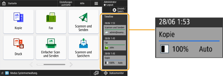 Weitere Informationen zu den im Verlauf angezeigten Symbolen und Elementen finden Sie in In der Timeline angezeigte Punkte. Für jeden angemeldeten Benutzer kann ein Verlauf angezeigt werden. Wenn er nicht angemeldet ist, kann ein gemeinsamer Verlauf für Benutzer angezeigt werden, die keine Authentifizierung verwenden, beispielsweise nicht authentifizierte Benutzer und Gastbenutzer. Ändern Sie die Einstellungen für <Nicht authentisierten Anwendern erlauben, Timeline zu verwenden> und <Jedem Login-Anwender erlauben, Timeline zu verwenden> entsprechend Ihren Bedürfnissen. Anpassen des <Startseite>-Bildschirms Der Verlauf von Benutzern, die sich nicht authentifizieren, wie nicht authentifizierte Benutzer und Gastbenutzer, wird gespeichert, wenn <Einstellungen Schnellstart für Hauptstrom> auf <Ein> eingestellt ist und ein Schnellstart durchgeführt wird. Wenn das Gerät ausgeschaltet ist und <Einstellungen Schnellstart für Hauptstrom> auf <Aus> gestellt ist oder der Schnellstart nicht durchgeführt werden konnte, wird der Verlauf von Benutzern, die sich nicht authentifizieren, wie nicht authentifizierte Benutzer und Gastbenutzer, gelöscht. Der Verlauf lässt sich weder importieren noch exportieren. Importieren/Exportieren von Einstellungsdaten |