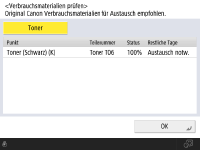 Sie können die verbleibenden Menge an Verbrauchsmaterialien über Remote UI überprüfen. Überprüfen des Gerätestatus |