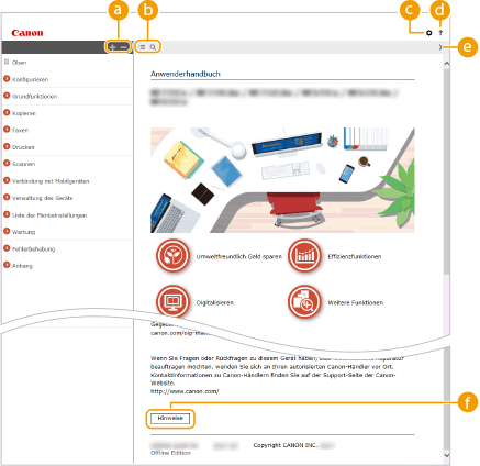 Klicken Sie auf diese Option, um Informationen zur Anzeige der Anwenderhandbuch zu lesen, wie eine Suche durchgeführt wird und andere Informationen.