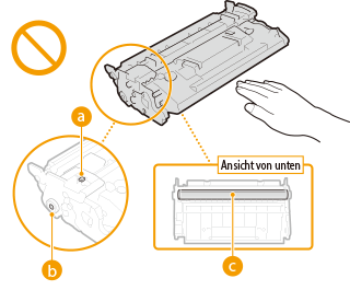 Tauschen Sie die Tonerpatronen erst dann aus, wenn die entsprechende Aufforderung erscheint. Halten Sie die Tonerpatrone unbedingt am Griff fest. Berühren Sie nicht den Speicher der Tonerpatrone (  ), die elektrischen Kontakte (  ) oder den DRAM (  ). |