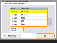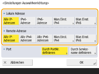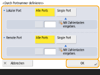 3 | Legen Sie den Anschluss fest, an dem IPSec angewandt werden soll. Drücken Sie <Durch PortNr. definieren>, um die Portnummern zu verwenden, sobald Sie die Anschlüsse festlegen, bei denen IPSec angewandt wird. Wählen Sie <Alle Ports> aus, um IPSec bei allen Portnummern anzuwenden. Um IPSec bei einer spezifischen Portnummer anzuwenden, drücken Sie <Single Port>, und geben Sie die Portnummer ein. Nachdem Sie die Anschlüsse festgelegt haben, drücken Sie <OK>. Legen Sie den Anschluss dieses Geräts unter <Lokaler Port> fest, und legen Sie den Anschluss des Kommunikations-Peer unter <Remote Port> fest. ![]() Drücken Sie <Durch Servicename definieren>, um die Dienstnamen zu verwenden, sobald Sie die Anschlüsse festlegen, bei denen IPSec angewandt wird. Wählen Sie den Dienst in der Liste aus, drücken Sie dann <Service Ein/Aus>, und ihn auf <Ein> zu setzen, und drücken Sie anschließend <OK>. ![]() | ||||||||||||||
