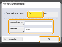 <Authentisierung einstellen>Drücken Sie diese Schaltfläche, und konfigurieren Sie die Authentifizierungsinformationen, um die Authentifizierungsfunktion des Proxyservers zu verwenden. Drücken Sie im eingeblendeten Fenster auf <Ein>, geben Sie den Benutzernamen und das für die Proxyauthentifizierung zu verwendende Passwort ein, und drücken Sie <OK>.