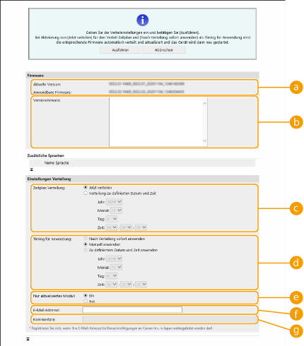 [Zeitplan Verteilung]Um die Firmware sofort herunterzuladen, wählen Sie [Jetzt verteilen]. Um die Firmware an einem bestimmten Datum zu einer bestimmten Uhrzeit automatisch herunterzuladen, wählen Sie [Verteilung zu definierten Datum und Zeit], und legen Sie das Datum und die Uhrzeit in [Jahr]/[Monat]/[Datum]/[Zeit] fest. Sie können die Zeit eine Woche im Voraus planen.