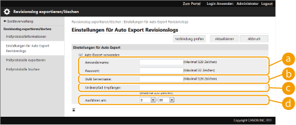 Nach dem erfolgreichen automatischen Export der Revisionslogs werden die gesammelten Revisionslogs automatisch gelöscht. Revisionslogs können nicht manuell gelöscht werden. Nachdem das automatische Exportieren und Löschen der Audit-Protokolle erfolgreich durchgeführt wurde, werden die einzelnen Protokolle generiert. Wenn bis zum Zeitpunkt des nächsten automatischen Exports keine anderen Protokollsammlungen erfolgen, wird das Audit-Protokoll nicht automatisch exportiert. Sie können die Revisionslogs auch manuell über Remote UI exportieren. Exportieren eines Protokolls in eine Datei Wenn der automatische Export fehlschlägt, unternimmt das Gerät mehrere erneute Versuche. Auf dem Bedienfeld des Geräts wird eine Fehlermeldung angezeigt, sobald ein automatischer Export fehlgeschlagen ist. Geben Sie einen SMB-Server für Windows Server 2012 oder höher oder für Windows 10 oder höher an. Bei ausgeschaltetem Gerät wird auch zu den festgelegten Zeiten kein Export durchgeführt. Der Export wird auch beim nächsten Start des Geräts nicht durchgeführt. Wenn sich das Gerät im Schlafmodus befindet, wird es zur festgelegten Zeit automatisch reaktiviert, und der Export wird durchgeführt. Beachten Sie, dass bei Verwendung eines Servers, der eine nach SMB 3.0/3.1 verschlüsselte Kommunikation nicht unterstützt, die Revisionsprotokolldaten beim automatischen Export unverschlüsselt über die Kommunikationspfade übertragen werden. Je nach Umgebung wird der automatische Export von Logs eventuell später als zur festgelegten Zeit durchgeführt. |