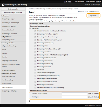 Das Passwort in [Passwort Verschlüsselung] ist erforderlich, wenn exportierte Einstellungsdaten importiert werden. Verwenden Sie alphanumerische Zeichen.