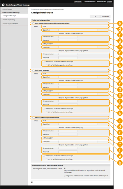 Wenn die Funktion Visual Message festgesetzt ist, können Sie den Inhalt unter <Visual Message> im <Startseite>, unabhängig vom Zeitpunkt, überprüfen. Der zuletzt angezeigte Inhalt wird angezeigt. Legen Sie für den anzuzeigenden Inhalt eine Datei fest, die auf einem Dateiserver oder in der Erweiterter Platz eines anderen Canon Multifunktionsdruckers im selben Netzwerk gespeichert ist. Arbeiten mit anderen GerätenSie können über einen Proxy-Server auch eine Webseite auf dem Internet als Inhalt festlegen. Die Proxy-Einstellungen, die für diese Funktion verwendet werden, sind die gleichen wie die Einstellungen unter <Einstellungen Proxy>. Wenn die Funktion für erzwungen angehaltene Druckaufträge und das Kontrollkästchen für [Wenn Druckauftrag startet anzeigen] aktiviert sind, wird zu Beginn des Druckens der Inhalt angezeigt. |