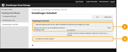Um den Inhalt anzuzeigen, nachdem der Modus zur automatischen Rückstellung initiiert wurde, legen Sie <Zeit bis zur automatischen Rückstellung> auf mindestens eine Minute fest. Weitere Informationen über Dateiformate und Dateigrößen, die angezeigt werden können, siehe Verwaltungsfunktionen. Diese Einstellung kann nur von einem Benutzer mit Administratorrechten festgelegt werden. Diese Einstellung kann importiert/exportiert werden. Dieselbe Einstellung kann in mehrere Geräte importiert werden (nur Canon-Geräte, welche die Funktion Visual Message unterstützen), um die gleiche Notiz oder Information auf mehreren Geräten anzuzeigen. Importieren/Exportieren von Einstellungsdaten[Dateipfad:] wird mit dieser Einstellung importiert/exportiert. Wenn eine Datei im Erweiterter Platz angegeben ist und auf dem exportierenden Gerät angezeigt wird, führen Sie Folgendes aus: Kopieren Sie die Datei im Erweiterter Platz des exportierenden Geräts manuell in den Erweiterter Platz des importierenden Geräts. Ändern Sie [Dateipfad:] in den Pfad, in dem sich die Datei befindet. Bevor Sie Anmeldefunktionen durchführen, schließen Sie den Bildschirm Visual Message. Anmelden beim Gerät |