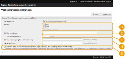 In den folgenden Fällen kann die Synchronisierung festgelegt werden, ohne Schritt 4 durchzuführen. Wenn sich die zu synchronisierenden Geräte innerhalb desselben Routers befinden. Wenn <Anwenderauthentisierung verwenden> auf dem Servergerät auf <Ein> gestellt (siehe <Anwenderauthentisierung verwenden>) und "Anwenderauthentisierung" als Anmeldedienst festgelegt ist (siehe Ändern der Anmeldedienste) Wenn auf den Clientgeräten unter [ID Anwenderzugang für Authentisierung:] nichts eingegeben ist (das Element ist NULL) Wenn der Dienst zum Synchronisieren der benutzerdefinierten Einstellungen auf dem Servergerät gestartet wird (ist das Gerät ein Server-/Clientgerät, kann die Einstellung durch gleichzeitiges Starten des Server- und des Clientdiensts geändert werden) Wenn in einem Netzwerk nur ein Servergerät zum Synchronisieren der benutzerdefinierten Einstellungen vorhanden ist Der Clientcomputer kann sich in den folgenden Fällen nicht über die Suche verbinden. Geben Sie die IPv4-Adresse für die Zielserveradresse ein. Wenn die Netzwerkeinstellungen des Servers sowohl IPv4 als auch IPv6 beinhalten, wird IPv6 bevorzugt und IPv6 wird auf dem Clientcomputer deaktiviert. Wenn die Hauptleitung für die Netzwerkeinstellungen des Servers und die Nebenleitung für die Netzwerkeinstellungen des Clientcomputers verwendet wird. Wenn die Nebenleitung für die Netzwerkeinstellungen des Servers verwendet wird, legen Sie die folgenden Einstellungen fest. Server und Clientcomputer: Geben Sie die IP-Adresse der Hauptleitung oder den localhost als Adresse des Zielservers ein. Clientcomputer: Geben Sie die IP-Adresse der Nebenleitung des Servers als Adresse des Zielservers ein. |