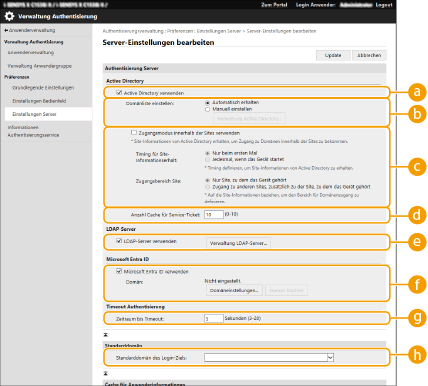 ![]() | Um Active Directory, Microsoft Entra ID oder einen LDAP-Server als ein zusätzliches Authentifizierungsgerät festzulegen, müssen Sie die für die Authentifizierung verwendeten Informationen des Servers registrieren. Führen Sie bei Bedarf einen Verbindungstest durch. |