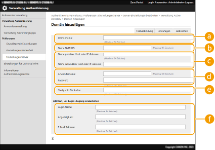 4 | Geben Sie die erforderlichen Informationen ein. ![]() [Domänname:]Geben Sie den Domainnamen von Active Directory ein, bei dem es sich um das Anmeldeziel handelt (Beispiel: company.domain.com). [Name NetBIOS]Geben Sie den NetBIOS-Domainnamen ein (Beispiel: company). [Name primärer Host:] / [Name sekundärer Host]Geben Sie den Hostnamen des Active Directory-Servers oder die IPv4-Adresse ein. Bei Verwendung eines sekundären Servers geben Sie den Namen unter [Name sekundärer Host] ein. Beispiel: Bei Verwendung eines Hostnamens: ad-server1 Bei Verwendung einer IPv4-Adresse: 192.168.18.138 [Anwendername:] / [Passwort:]Geben Sie den Benutzernamen und das für den Zugriff und die Suche des Active Directory Servers zu verwendende Passwort ein. [Startpunkt für Suche:]Geben Sie den Speicherort für den Zugriff und die Suche auf dem Active Directory Server an. [Login-Name:] / [Angezeigt als] / [E-Mail-Adresse]Legen Sie die Datenfelder (Attributnamen) für den Anmeldenamen, Anzeigenamen und die E-Mail-Adresse des jeweiligen Benutzerkontos im Active Directory Server fest (Beispiel: sAMAccountName, cn, mail). |