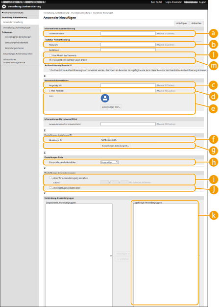 dc | Nein | 0 bis 32 Zeichen | Kontrollzeichen | - (N/A) | Kann nicht geändert werden. Wird den folgenden Benutzern automatisch zugewiesen. Nach Server-Authentifizierung registrierte Benutzer |