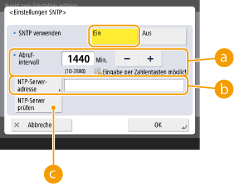 Drücken Sie <Ein> in <SNTP verwenden>, und nehmen Sie die erforderlichen Einstellungen vor.