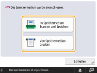 Wenn <Bei Anschluss an Speichermedium Option wählen> auf <Ein> festgelegt ist, werden Verknüpfungen zu den verfügbaren Funktionen angezeigt, wenn Sie Speichermedien einsetzen. <Bei Anschluss an Speichermedium Option wählen> ![]() Da die Verknüpfungen möglicherweise nicht angezeigt werden, wenn sich das Gerät im Schlafmodus befindet, setzen Sie das Speichermedium ein, nachdem das Gerät den Schlafmodus verlassen hat. |