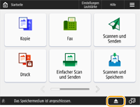 Prüfen vor der Verwendung von SpeichermedienZur Verwendung der Speichermedien ist es erforderlich, dass <Speichermedium> in <Einstellungen Anzeige Speicherort> auf <Ein> gesetzt wird. <Einstellungen Anzeige Speicherort> Setzen Sie <Scanfunktion verwenden> und <Druckfunktion verwenden> auf <Ein>. <Scan/Druckfunktion verwenden> Wenn das Speichermedium trotz dem korrekten Anschluss nicht erkannt wird, ist es möglich, dass das Gerät für externe USB-Speichergeräte auf den MEAP-Treiber eingestellt ist. Setzen Sie <MEAP-Treiber für USB-Eingabegerät verw.> auf <Aus>. <MEAP-Treib.für ext.USB-Speich.gerät verw.> |