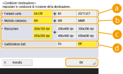 Se il server LDAP è già stato registrato nella macchina (Registrazione del server LDAP), è possibile cercare le destinazioni e registrarle nella Rubrica. Premere <Dest./Impostaz. inoltro>  <Registrazione destinazioni>  <Regis. nuova destinazione>  <Registraz. da server LDAP> e cercare le destinazioni tramite <Ricerca per condizioni>.