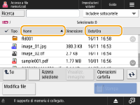 Se sono presenti più lavori/file in un elenco, è possibile premere <Nome> o <Data/Ora> per ordinare l'elenco di voci. Quando è visualizzato