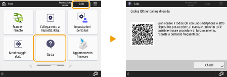 Premendo <Guida>, viene visualizzato un codice QR. Scansionando questo codice QR con un dispositivo mobile, come uno smartphone o un tablet, è possibile accedere alla pagina Guida per l'utente per questa macchina.