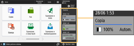 Per informazioni sulle icone e sugli elementi visualizzati nella timeline, vedere Voci visualizzate nella timeline. Una timeline può essere visualizzata per ciascun utente che ha effettuato l'accesso. In caso di utenti che non hanno effettuato l'accesso, come utenti non autenticati o utenti ospiti. può essere visualizzata una timeline condivisa. Modificare le impostazioni per <Consentire uso Timeline a utenti non autenticati> e <Consentire uso Timeline a ogni utente di accesso> in base alle necessità. Personalizzazione della schermata <Home> La timeline per gli utenti che non usano l’autenticazione, come gli utenti non autenticati e gli utenti ospiti, viene memorizzata quando <Impostaz. avvio rapido per alimentazione principale> è impostato su <On> e si esegue l'avvio rapido. Quando la macchina viene spenta con <Impostaz. avvio rapido per alimentazione principale> impostato su <Off> o non è stato possibile eseguire l’avvio rapido, la timeline per gli utenti che non usano l’autenticazione, come gli utenti non autenticati e gli utenti ospiti, viene eliminata. La timeline non può essere importata/esportata. Importazione/esportazione dei dati di impostazione |