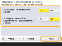 Per registrare un pulsante personale, è necessario accedere con la gestione dell'autenticazione personale. Configurazione delle impostazioni di gestione dell'autenticazione personale Se si seleziona <Informazioni autenticaz. accesso periferica> per <Inform. usate per autenticaz. TX file/sfoglia>, non viene memorizzata alcuna password per la destinazione del file in un pulsante personale. <Inform. usate per autenticaz. TX file/sfoglia> Per informazioni sul numero massimo di pulsanti personali e pulsanti condivisi che è possibile registrare, vedere Funzioni di gestione. Non è possibile cambiare i pulsanti personali in pulsanti condivisi e viceversa. Per farlo, richiamare le impostazioni e registrare un altro pulsante da .Tenere premuto un pulsante per modificarne il nome/commento o spostarlo/eliminarlo. Le stesse operazioni (modifica del nome/commento o spostamento/eliminazione di un pulsante) possono essere eseguite da nella schermata <Home>. Personalizzazione della schermata <Home>I pulsanti personali possono essere condivisi tra più periferiche sincronizzando i dati personalizzati. Elenco di voci personalizzabili Impostazioni registrabili nei pulsanti personali/pulsanti condivisiDi seguito sono indicate le funzioni e le impostazioni che possono essere registrate nei pulsanti personali/pulsanti condivisi. Impostazioni che possono essere registrate in <Impostazioni preferite> per la funzione <Copia> Riduzione delle operazioni di copia <Fax> impostazioni della funzione fax della macchina Operazioni di base per l'invio di fax Impostazioni che possono essere registrate in <Impostazioni preferite> per la funzione <Scansione e invio> Funzioni di scansione utili Impostazioni che possono essere registrate in <Impostazioni preferite> per la funzione <Scansione e memorizzazione> Impostazione della schermata e delle attività per la scansione e il successivo salvataggio Salvare le posizioni per le funzioni <Scansione e memorizzazione> e <Accesso a file memorizzati> Utilizzo dello spazio di memorizzazione Scelte rapide per la schermata delle funzioni di base per la funzione <Mailbox fax/I-Fax> È possibile registrare l'accesso a un server e la password di accesso nei pulsanti personali/pulsanti condivisi, in modo da evitare l'inserimento della password quando si richiama il pulsante registrato. Se si desidera definire la password nelle impostazioni memorizzate nel pulsante registrato, poiché si importano spesso le impostazioni in un pulsante personale o condiviso in un'altra macchina e si desidera evitare che gli utenti assumano l'identità di altri, escludere la password quando si registra. Importazione/esportazione dei pulsanti registratiÈ possibile importare ed esportare i pulsanti registrati Personali/Condivisi dall'IU remota. Importazione/esportazione di tutte le impostazioni L’importazione batch di pulsanti Personali/Condivisi potrebbe non essere disponibile a seconda del modello di macchina da cui importare. Per ulteriori informazioni, contattare il rivenditore o il rappresentante di servizio. |