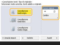 Quando si copiano documenti più piccoli del formato carta di uscita, nell'immagine copiata possono apparire delle righe del riquadro degli originali. Quando si copiano libri spessi, possono apparire bordi scuri. <Cancellazione bordi> consente di cancellare righe del riquadro e bordi scuri. Inoltre, è possibile impostare la macchina affinché non copi i fori negli originali.