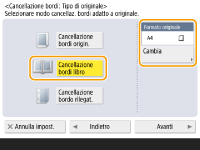Se si desidera regolare la larghezza singolarmente per ciascun bordo, premere <Cancellazione bordi origin.> o <Cancellazione bordi libro>, quindi premere <Regolazione indipendent.> per inserire le larghezze di cancellazione.