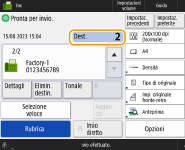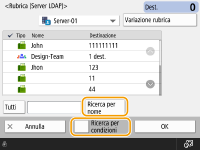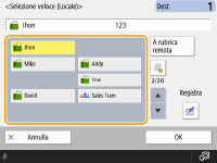 È possibile utilizzare <Regis. nuova destinazione>, <Dettagli/Modifica> e <Elimina> in <Registra/Modifica> nella schermata Rubrica (Locale) per registrare nuove destinazioni, verificarne i dettagli e modificare/eliminare le destinazioni. Per utilizzare la rubrica remota, è necessario configurare le impostazioni della macchina server. Impostare l'apertura della rubrica remota esternamente sulla macchina server. |