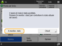 Per verificare il numero totale di destinazioni specificateIl numero totale di destinazioni specificate viene visualizzato in alto a destra della schermata. Ciò consente di verificare che il numero di destinazioni sia corretto prima dell'invio. ![]() Per inviare con le informazioni del mittenteÈ possibile effettuare l'invio con il nome e il numero di fax del mittente. <ID terminale TX> Per controllare lo stato dei documenti inviatiSulla schermata <Monitoraggio stato>, è possibile verificare lo stato dei documenti inviati. Questa schermata consente di inviare nuovamente i fax o di annullare l'invio dopo aver verificato lo stato. Controllo di stato e registro per i documenti inviati e ricevuti Se <Visualizzazione notifica ad accettazione lavoro> è impostato su <On>, la schermata <Monitoraggio stato> potrebbe essere visualizzata dalla seguente schermata, visualizzata dopo la ricezione di un lavoro inviato. <Visualizzazione notifica ad accettazione lavoro> ![]() Quando si verifica un errore di trasmissione perché la linea del destinatario è occupataLa macchina compone nuovamente il numero in automatico dopo un certo periodo di tempo. È possibile cambiare le impostazioni, ad esempio il numero di volte che la macchina ricompone il numero e l'intervallo tra un tentativo e l'altro. <Ricomposizione automatica> Per stampare il rapporto dei risultati dell'invioNella schermata delle funzioni di base fax, premendo <Opzioni> <Rapporto risultato TX> è possibile impostare la stampa automatica del rapporto che elenca i risultati dell'invio.Per impostare per ogni lavoro da <Opzioni>, è necessario selezionare <Solo se errore> o <Off> in <Rapporto risultato TX>, quindi impostare <Consentire stampa da Opzioni> su <On>. Se le foto nell'immagine inviata sono troppo chiare o scure, i colori dello sfondo degli originali non possono essere rimossiLa qualità dell'immagine inviata può essere migliorata se si osservano le seguenti condizioni/impostazioni. Tipo di lavoro: fax (invio memoria) o scansione e invio (Fax/I-fax) <Selezione colore>: <Bianco e Nero> (Scansione e invio) <Tipo di originale>: <Testo> <Densità> <Densità sfondo>: <Autom.><Risoluzione>: 200 dpi x 400 dpi, 300 dpi x 300 dpi*, 400 dpi x 400 dpi, o 600 dpi x 600 dpi* *Impostabile per Scansione e invio <Priorità velocità/qualità immagine per scansione B&N> Lavori di invio fax/I-Fax: <Priorità qualità> (<Priorità velocità/qualità immagine per scansione B&N>) |