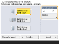 <Cancellazione bordi>.1 | Premere <Cancellazione bordi origin.> e selezionare <Formato originale>. ![]() Se il formato visualizzato in <Formato originale> è diverso da quello dell'originale, premere <Cambia> per selezionarlo. È possibile impostare solo la modalità di cancellazione cornice originale per i formati originali mostrati sul pannello digitale. |