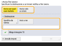Se si seleziona <Avviso per qualsiasi risultato>, viene inviata un'e-mail di notifica per ogni lavoro inviato. Se si seleziona <Avviso solo se errore>, viene inviata una notifica e-mail solamente quando si verifica un errore.