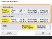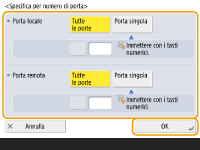 Premere <Specifica per numero di porta> per utilizzare i numeri di porta quando si specificano le porte a cui applicare l'IPSec. Selezionare <Tutte le porte> per applicare l'IPSec a tutti i numeri di porta. Per applicare l'IPSec ad un numero di porta specifico, premere <Porta singola> e inserire il numero di porta. Dopo aver specificato le porte, premere <OK>. Specificare la porta di questa macchina in <Porta locale> e specificare la porta del peer di comunicazione in <Porta remota>.